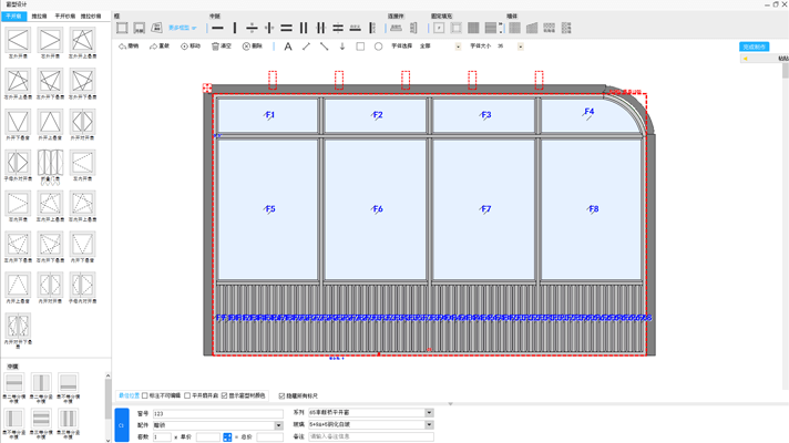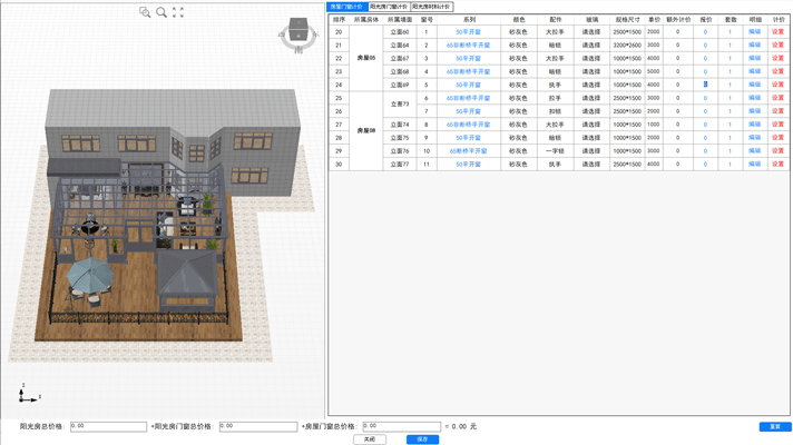 生成陽光房立面窗型大樣圖,可自定義陽光房單價,自動計算成品門窗價格,一鍵打印陽光房報價方案